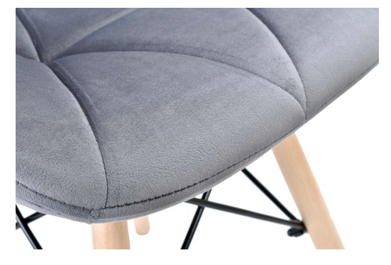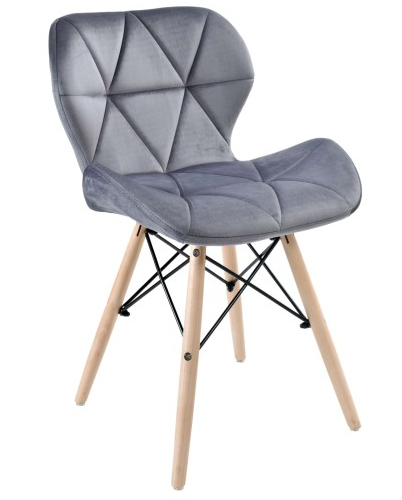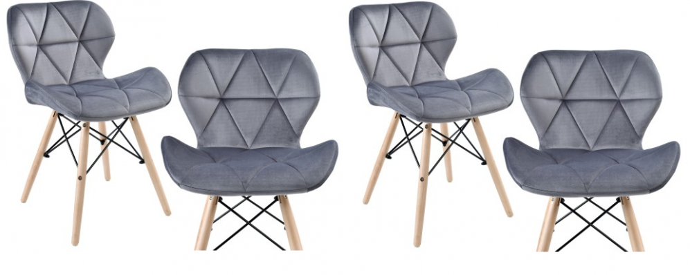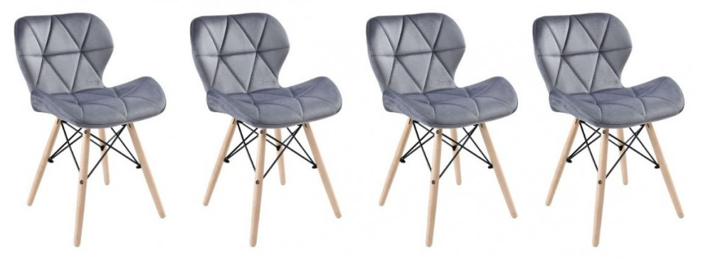 Komplet štirih jedilnih stolov v sivi barvi z lesenimi nogami.